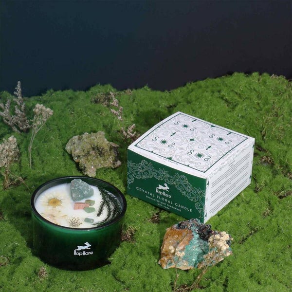Gehuld in een diepgroene glazen container met een rustieke houten lont, is elke Hop Hare Crystal Magic Candle een uniek meesterwerk. Onthul de magie binnenin terwijl je een edelsteen ontdekt, vergezeld van een snufje kleinere edelsteenstukjes, wat een verbluffende weergave van natuurlijke wonderen creëert. De essentie van deze kaarsen wordt verder verhoogd door de delicate gedroogde bloemen.