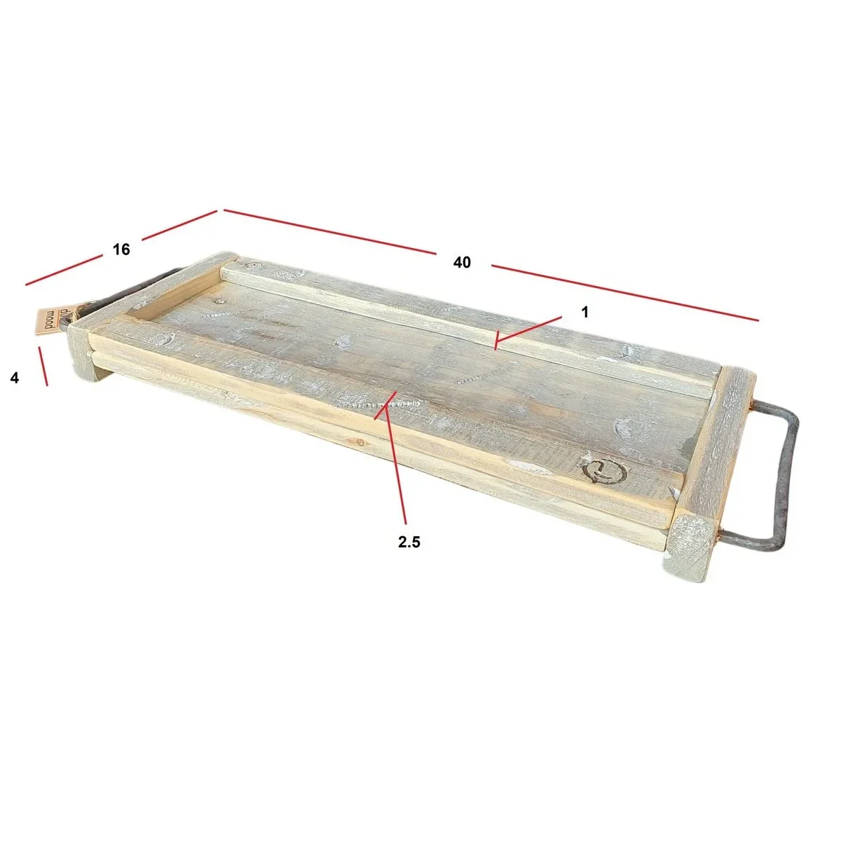 dienblad op voet en handgesmede metalen handvaten. Leuk voor kaarsen, glazen vaasjes, schelpen, of zijdebloemen. of als dienblad te gebruiken. Houten gedeelte is 40 cm lang, compleet met metalen handvaten ongeveer 46 cm.